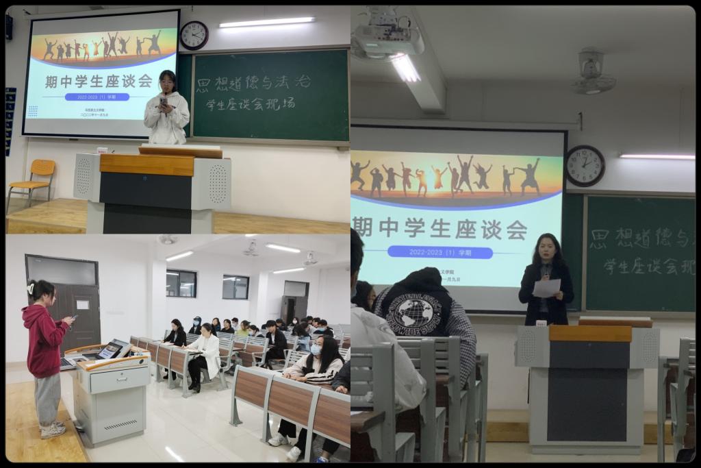 在思想道德与法治会场,陈志操老师整体介绍了思想道德与法治课程的授课情况,并明确了本次座谈会的目的。到会学生代表依次踊跃发言,积极反馈了广大同学关于教学条件、课堂教学、教学管理等方面问题的意见。在教学条件方面,学生普遍认为学校设施完善、资源丰富、环境卫生干净,但也反映了施工噪音大、上课电脑系统卡顿等问题;在课堂教学方面,学生普遍认为教师教姿教态端正、教学态度认真、教学内容充分、教学互动率高,但同时建议教师更多关注学生课堂参与度,坚持教育的主导性与主体性相统一,教师起到主导作用,学生发挥主体作用;在教学管理方面,学生普遍认为班级班风良好、学校督察较严格、学风建设较好;最后学生反映了出行不方便、餐厅卫生等方面的问题,希望学校加以帮助、加强监督。会上,陈志操老师根据到会学生代表的反馈进行总结发言,并对之后学院的教学改进方向与建设作出了明确表态。