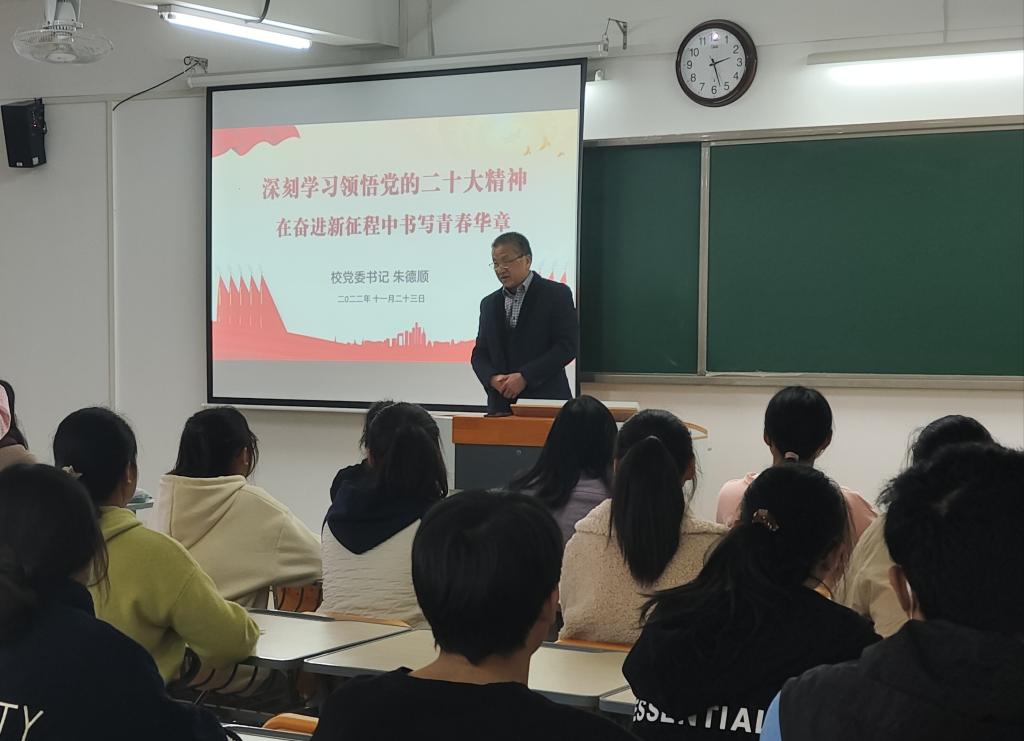 2022年11月23日下午在pg娱乐电子游戏官网入口第二教学楼322教室,校党委书记朱德顺为大一新生上了一堂精彩、激昂的“形势与政策”课,以“在奋进新征程中书写青春华章”为题,宣讲党的二十大精神。pg娱乐电子游戏官网入口院长助理陈志操主持,2022级经济学普本新生代表参加。