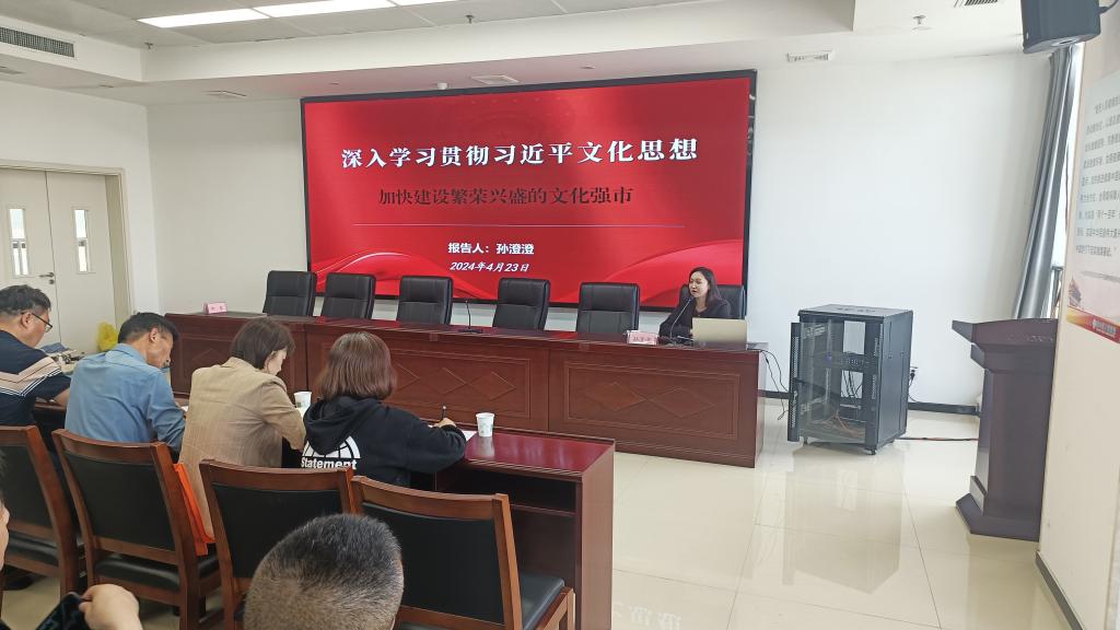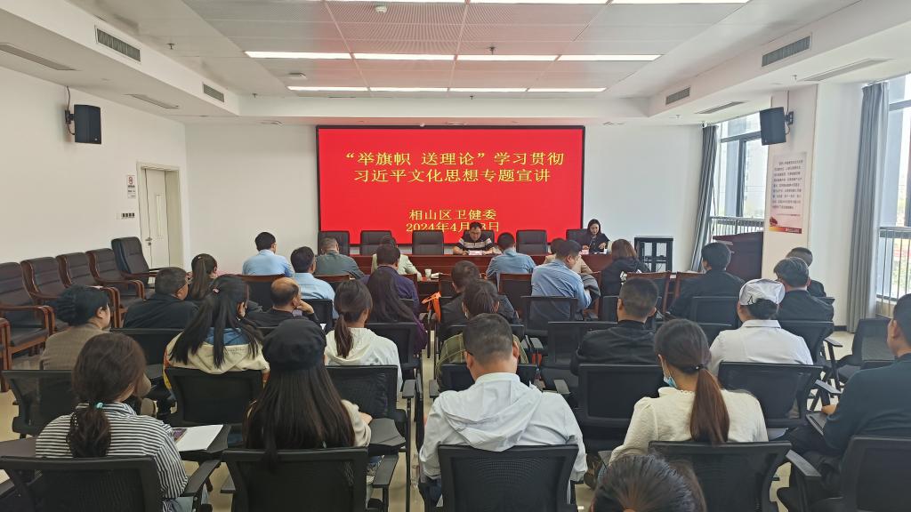 4月23日下午,淮北市相山区卫生健康系统“举旗帜·送理论”学习贯彻习近平文化思想宣讲报告会在相山区人民医院召开。pg娱乐电子游戏官网入口孙澄澄作为淮北市委宣讲团成员,受邀作题为《深入学习贯彻习近平文化思想·加快建设繁荣兴盛的文化强市》的宣讲报告。相山区卫生健康委班子成员全体参会,相山区卫生健康委党委书记柳泰主持会议。