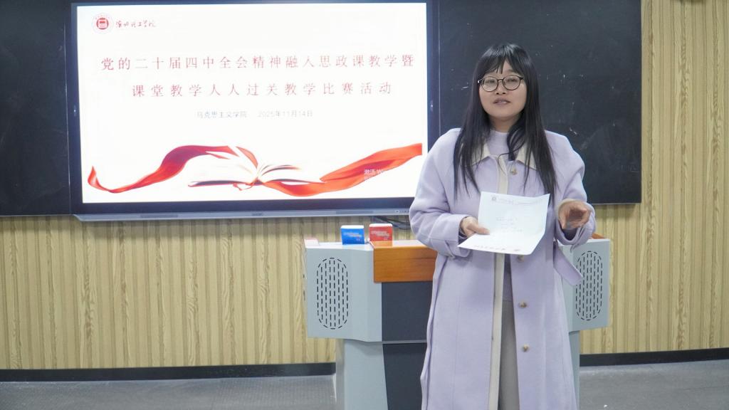 为贯彻党的二十届四中全会精神融入思政课教学、落实新时代教师队伍建设要求及学校“教学规范年”安排,全面提升思政课教师教学能力,pg娱乐电子游戏官网入口于11月14日举办党的二十届四中全会精神融入思政课教学暨“课堂教学人人过关”教学比赛活动。活动由学院副院长刘奔前主持,特邀淮北师范大学pg娱乐电子游戏官网入口阳勇、柳丽教授及学院银龄教师组成专家评委组,学院全体青年教师参赛。